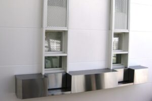 ご依頼を頂いてから、最終納品日までが約1ヶ月という、超短納期物件でした。時期的にもお盆を挟んで、大変な納期でしたが、営業・設計にてチームを組み、取り組んだ案件です。外装R型パネル、アルミルーバー、ファサードサッシ、SDほか内部造作金物までを、それぞれに担当しました。工場のメンバーはもちろん、営業・設計チームがまた一つ大きくなれた物件です。