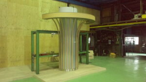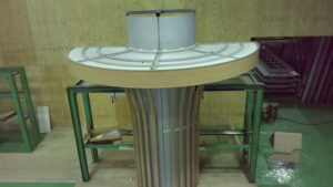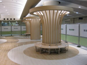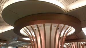 大阪市内の地下街広場の思い切ったリニューアルプラン。天井にむかって放射状に広がる角パイプルーバーを3×4列、12本。天井取り合いの円形間接照明とあわせて限られた夜間の作業時間内での施工。2015年に開設したストック・仮組スペースでのモックアップが大いに役立ちました。